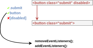 This is a not all-too-bad yet naive approach. It works well, but it’s inefficient, something which will become very noticeable once the stylesheet will grow bigger and bigger. One thing that can be done is to run the test() function of a specific selector before event listeners are disposed. If there has been a change in the outcome of tests, only then proceed to disposing and reallocating the event listeners.